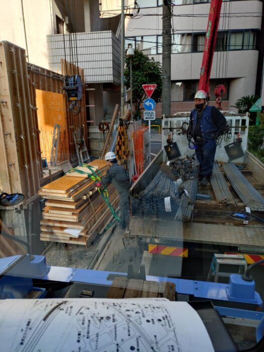 本日、鉄筋材搬入作業です。かなり狭い現場で電線の下から伸縮作業行い搬入致しました。作業は順調に進んで無事終わる事が出来ました。
