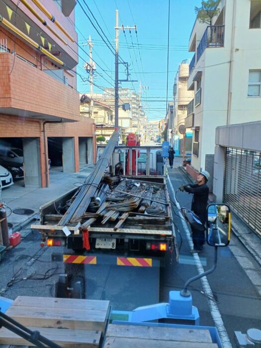 本日、引き続きの現場で鉄筋材搬入作業です。午前中トラック1台分搬入、午後振分作業行いました。作業は順調に進んで無事終わる事が出来ました。