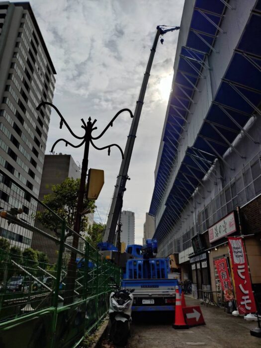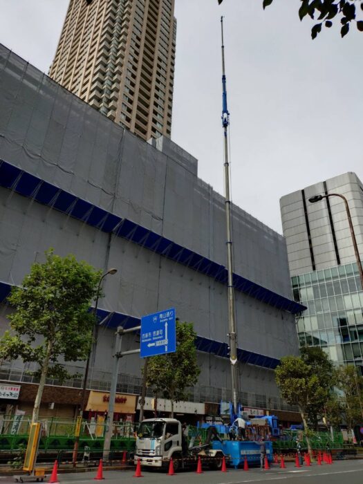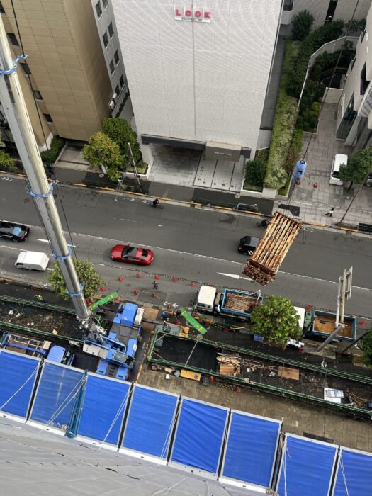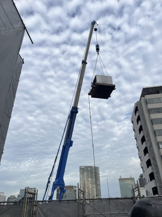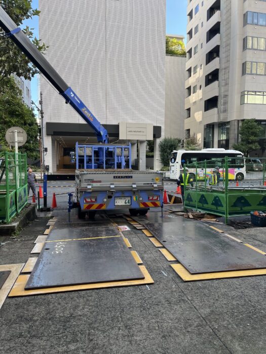 本日、引き続きの現場で防水材搬入作業です。弊社ユニック班がラフター35トン進入設置場所の通路鉄板養生施工してアウトリガー用鉄板養生施工しクレーン設置致しました。弊社作業員が屋上に上がり玉掛け作業、無線合図して作業行いました。鉄骨フェンス撤去後、防水材搬入して無事終わる事が出来ました。