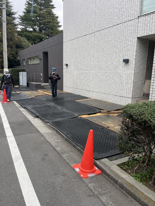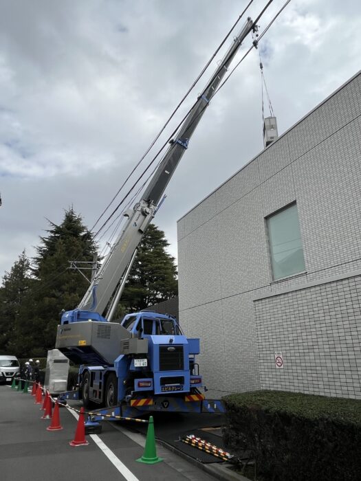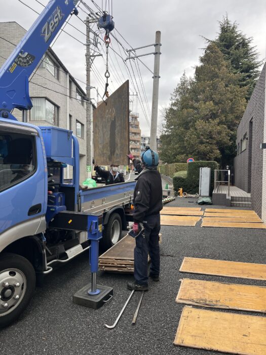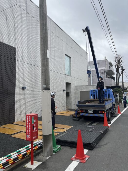 本日、電気設備揚重作業です。弊社ユニック班が鉄板養生施工してからラフター16トン進入設置。作業行いました。作業は順調に進んで無事終わる事が出来ました。