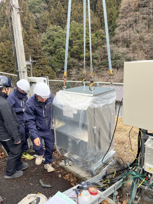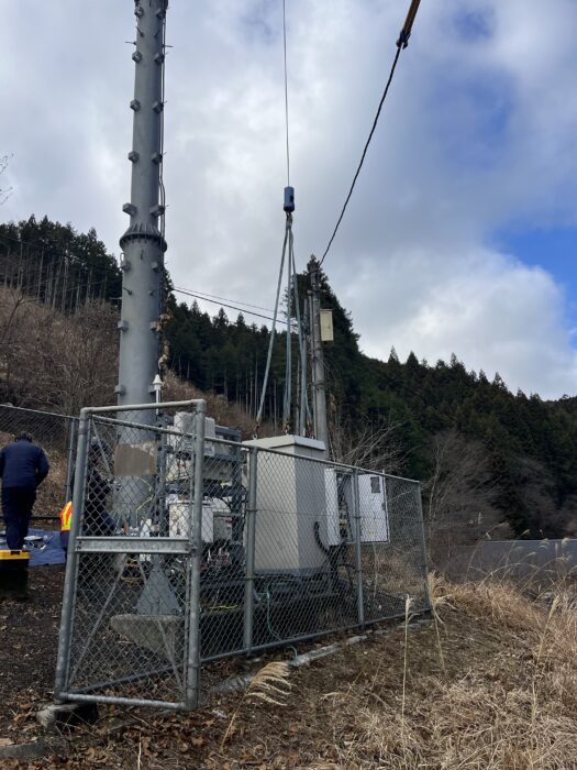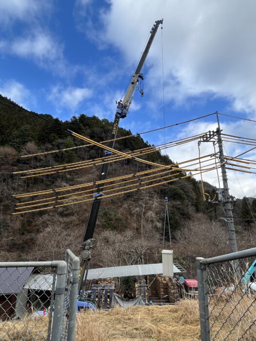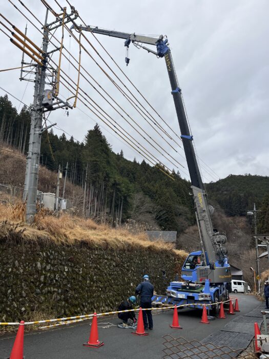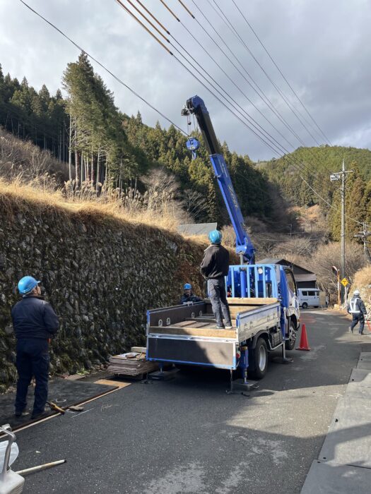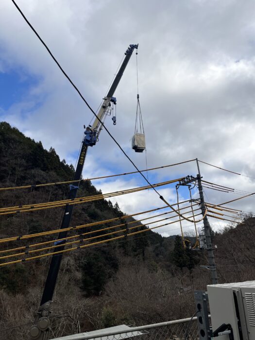 本日、電源箱の入替作業です。枡の上にアウトリガー張出の為弊社ユニック班が鉄板養生施工してからクレーン設置。高圧線越しの作業の為ピタゴラスの出番になりました。作業は順調に進んで無事終わる事が出来ました。