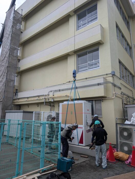 本日、GHP搬入設置作業です。新しいGHPと古い物を交換致しました。作業は順調に進んで無事終わる事が出来ました。