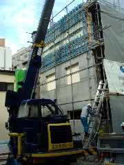 本日は室外機の荷揚げ作業です。インターロッキングと車止めで中に入ることが出来ず前面道路からジブ1段出しで目標まで届くことが出来ました。皆さんお疲れ様です、有難うございました。 (e) |