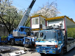 今日はユニットハウスの解体,積み込み作業です。カプセル付きのハウスなので通常のものより少し重量が重いので慎重に作業を行いました。4棟とも無事に積み込みが出来ました。 職方の皆さんお疲れ様でした。 (y) |