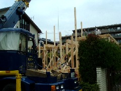 本日は木造建て方です。入り口通路越しでしたが前面道路にクレーン設置スペースがあったのでアウトリガ張り出しも出来、作業はやりやすかったです。