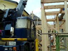 本日は木造の建て方です。敷地内の駐車スペースにクレーンセットし作業に当たりましたが、この辺は進入路が狭く、材料を積んだトラックが前面道路まで入って来れず、通路越の荷取りと乗り入れに若干苦労致しました。