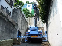 今日は、材料の搬入作業です。ここは先週も作業をしましたが、急坂にセットするので水平を出すのが大変です。電線をかわし、隣のお宅の雨樋ぎりぎりでやっと材料が降りるので、吊り込む度に気を使います。今日は、足場もばれて外構工事も始まりこのお宅の竣工も近いようです。大工さん、足場屋さん、お疲れ様でした。