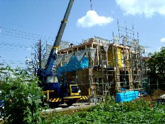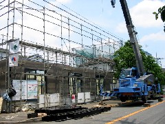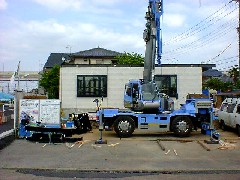 今日は鉄骨プレハブ住宅の建て方作業です。前面道路を片側通行止めで、電話線と足場を越しての作業です。ジブを出し無線機を使って安全に作業にあたりました。奥はぎりぎりで届きました。職人さん、ガードマンさん、大変暑い中お疲れ様でした。