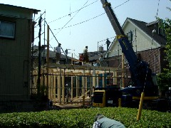 本日は木造建て方です。材料も足場もレッカー作業に合わせて段取りしていただいてあり、助かりました。とても手際よく作業は進みました。皆さんお疲れ様でした。有難うございました。