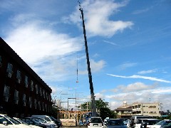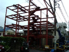 本日は鉄骨の残り仕事で前面道路側、手前のスパンを決めました。建物と電線の間にブームを滑り込ませての作業です。午前中豪雨に見舞われ視界も悪く一時中断致しましたが無事建て終えることが出来ました。皆さん雨の中お疲れ様でした。