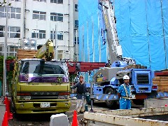 本日はプレハブの建て方です。周りに材料を置く場所も無くトラックごと基礎の中に入り、奥より建て逃げ致しました。概ね思惑通りに作業も運び一安心です。心配された雨も小降りで収まり作業終了、皆さんお疲れ様でした。明日も宜しくお願い致します。