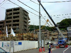 本日はRC現場の材料揚げで、道路から電線越しの作業です。2段ジブを出しての作業で歩道をまたぐ為、ガードマンさんの合図も確認しながら注意して作業いたしました。皆さんお疲れ様でした。有難うございました。