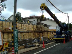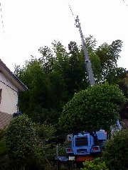 本日は丘の斜面にある社の据付でこの竹やぶの向こうに収めます。2段ジブでやぶの間にブームを倒し込んでいきますが、あと少し届きません。及ばずながらお手伝いさせて頂き、手レッカー作業で無事据付完了、皆さんお疲れ様でした。有難うございました。