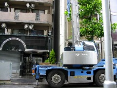 今日は室外機の搬入作業です。ビルとビルの間で人が一人入れるスペースのところにブームを倒し込んでいきます。両方のビルを壊さないように慎重に作業を行いました。無事に作業終了です。電気屋さん、お疲れ様でした。