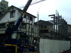本日は鉄骨の建て方です。910ミリピッチで柱が入るので部材の置き場所に苦労致しましたが、予定通りくみ上げることが出来ました。皆さん雨の中お疲れ様でした。