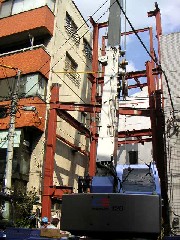 本日は鉄骨の建て方です。上部に電線が張り巡らされていて3角に空いた部分にブームを差込クレーンセット。荷取り、建て方共に制限される起伏角の為ジブラフィングを使い作業致しました。鳶さんも材料の置き場所が無く大変でした。皆さんお疲れ様でした。明日も宜しくお願い致します。