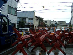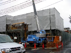 本日は鉄骨建て方です。現場は幹線道路に面した交通量の多いところなので、クレーンを路地に入れ込み速やかに部材を取り込みました。朝から雨が強く、この日は荷降ろしだけとなりました。皆さん雨の中お疲れ様でした。