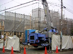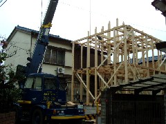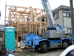 今日は木造建て方作業です。現場は狭い路地沿いですが、スペースを作っていただいたので通行の妨げにもならず作業が出来ました。化粧の丸太梁が入る立派なお宅でした。朝方は雨に降られましたがすぐに上がり無事に棟が上がりました。大工さん、鳶さん、監督さん、お疲れ様でした。御施主様上棟おめでとうございます。