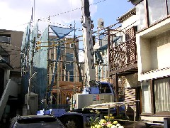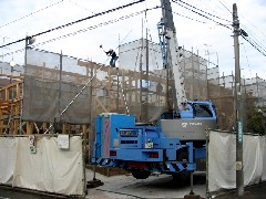 本日は木造の建て方です。前面道路が狭く電線もあり2段ジブラフィングを使い一杯の現場でした。生活道路なので歩行者にも注意しながら作業致しました。3階建ての梁が細かく入るとても立派なお宅です。皆さんお疲れ様でした。有難うございました。