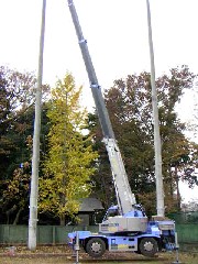 本日は野球場の防護ネット取り付け作業で25Mのマストの上にワイヤーを仕込んだキャップを取り付けします。2段ジブで3本づつセット換えしながら収めていきました。手際よくマストのトップまで登っていく職人さんの様子は「すごい」の一言です。皆さんお疲れ様でした。