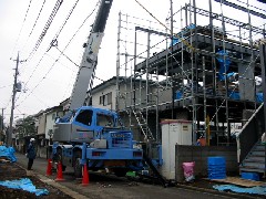 今日は軽量鉄骨の建て方作業です。住宅街の路地での作業です、幸いなことに電線の無い側での作業でしたのでやりやすかったです。寒い中での作業でしたが無事に躯体本体は終わりました。職方の皆さん、寒い中お疲れ様でした。