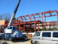 今日は鉄骨建て方作業です。今日の分は手前の部分とモヤ、胴ブチの取り付け作業でした。山の頂上に立つ立派なお宅です。