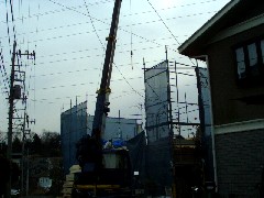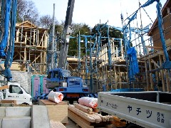 本日は木造の建て方です。前面足場があけてあったのでやりやすいところでこの日は2棟建てました。皆さんお疲れ様でした。