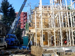本日はスチールツーバイで2階壁パネルの建て方作業です。ここはクレーン設置場所の上にお隣のお宅への引込み線があり荷取りにはとても注意が必要です。建物はとても面白い構造で私も興味深く作業させていただきました。皆さんお疲れ様でした。また宜しくお願い致します。