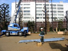 今日は防球ネットの取り付け工事の現場です。柱間を繋ぐビームの取り付けがメインの作業です。既にネットは張ってあるのですが校庭が狭くボールが飛び越えてしまうそうで、かさ上げをするそうです。