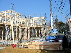 今日は木造建て方作業です。全16棟現場の5.6棟目の建て方作業でした。午後からは強い南風が吹いたので、慎重に作業を行いました。風は春1番でした。無事に2棟とも棟が上がりました。大工さん、お疲れ様でした。