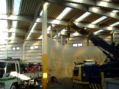 本日はごみ処理場で鉄骨仕切り板の移設作業です。建屋の中で作業の為、吊りしろをとるのに苦労致しましたが、予定の作業は無事終了。鉄骨屋さんお疲れ様でした。