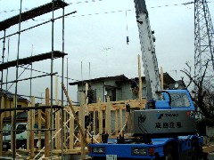 本日は木造建て方です。クレ-ン設置部の足場は後掛けなので作業は良好でした。皆さんお疲れ様でした。また宜しくお願い致します。
