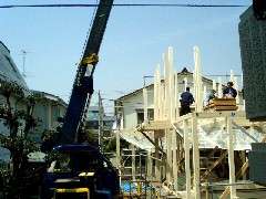 本日は木造の建て方です。敷地内に入れてクレーンセット、旋回体後部にツゲの木がありましたが、小旋回の特徴を生かして作業できました。皆さんお疲れ様でした。お施主様上棟おめでとうございます。