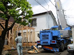 今日は木造住宅の増築現場で建て方作業です。電線越しの作業でジブを出しての作業です。既存の建物とのかね合いがあり大工さんは大変そうでした。一時雷雨にあいましたが無事に棟が上がりました。大工さん、鳶さん、1日お疲れ様でした。御施主様上棟おめでとうございます。