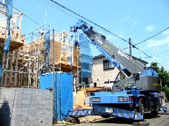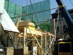 今日は木造建て方作業の現場です。電話線に泣かされた現場で線を越して材料を送り、線の下から2棟を建てました。苦労をしましたが無事に2棟とも棟が上がりました。大工さん、暑い1日お疲れ様でした。