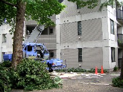 引き続きの現場でこの日は敷地内インターロック舗装部分からの作業です。予定最終日で建物に掛かる部分を重点的に剪定していきました。景観を大事にする作業はクレーンのブーム振り回しを時として困難にしますが、ジブラフィングで何とか枝周り行きわたることが出来、予定の作業は終了できました。マメなセット換えの為、造園屋さんも総動員で地盤養生に追われ大変でしたが皆様お疲れ様でした。1週間有難うございました。また宜しくお願い致します。