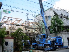 今日は木造建て方作業の現場です。狭いスペースにクレーンを入れて、電線をかわせたので建て方作業は上手くできました。構造材と材料の荷取りに少し苦労しましたが、無事に棟が上がりました。暑い1日、大工さん、監督さん、お疲れ様でした。