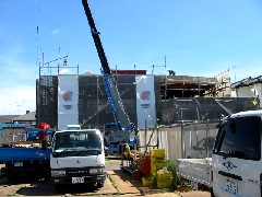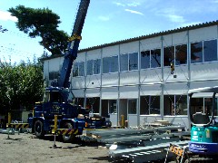 本日はプレハブの建て方作業で外回りの廊下と階段の取り付けを行いました。棟越しのため若干厳しいところもありましたがセット替えと取り回しで無事取り付けることが出来ました。皆さんお疲れ様でした。