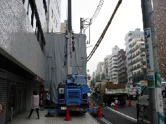 今日はビルの解体作業の現場です。このビルは大変に狭くユンボでの解体が出来ず、壁と鉄骨を中で小分けに解体してクレーンで搬出積み込みをしています。お隣のビルの敷地をお借りしての作業で、積み込みのトラックは大通りに横付けなので、歩行者と車に注意して積み込みました。解体屋さん、1日お疲れ様でした。