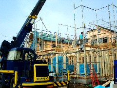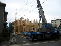 今日は全4棟現場での木造建て方作業で、2,3棟目を建てました。最初は通路で、次は近隣のために通路をあけて、表から作業を行いました。無事に2棟とも棟が上がりました。大工さん1日お疲れさまでした。