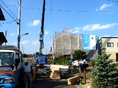 今日は2×4住宅の建て方作業です。2日目の作業で、屋根パネルの組み立て作業です。電線もなにもなく広い路地突き当たりで作業はやりやすかったです。大工さん1日お疲れさまでした。