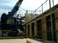 引き続きツーバイパネル住宅の建て方です。奥行きもあり脇に進入、旋回出幅一杯の作業でしたが無事こなすことが出来ました。皆さんお疲れ様でした。明日も宜しくお願い致します。