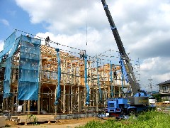 今日は木造建て方作業の現場です、2棟同時進行で建てました。全24棟の3,4棟目で、まだまだ場所が広いので作業はやりやすかったです。暑い中での作業でしたが、無事に2棟とも棟があがりました。大工さん1日お疲れさまでした。
