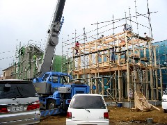 今日は木造建て方作業です。広い敷地からの作業で大変にやりやすかったです。昨日とは打って変わって涼しい天気で作業もはかどり、無事に棟上げです。大工さん、監督さん、1日お疲れさまでした。お施主様上棟おめでとうございます。