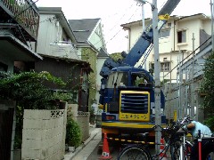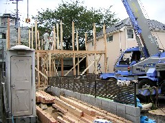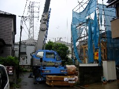 今日は木造建て方作業の現場です。狭い路地に面した現場で、道路を使っての作業です。道路真上には送電線があり、東電さんが1日見張りをしてくれました。午後から雨になりましたが棟は無事にあがりました。大工さん、1日お疲れさまでした。