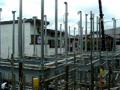 本日は鉄骨の建て方です。前面道路が非常に狭く近隣の生活道路でもあるためクレーン進入設置に苦労致しました。この日は部材の荷取りと1階部分の組み立てを行いました。皆さんお疲れ様でした。