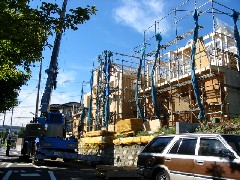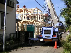 今日は木造建て方作業の現場です。全3棟現場で、1号、3号棟を建てました。道路からの作業でしたが電線もなく、通りも少なく作業はやりやすかったです。無事に2棟とも棟が上がりました。大工さん、監督さん、1日お疲れさまでした。