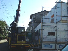 本日はジブ出しで屋根防水材の荷揚げと木造注文住宅の建て方作業です。前面道路からの作業で上部電線があるのと、人の往来が多く注意して作業を進めました。防水材は早朝揚げて夕方釜等機材をおろしこの日の予定はすべて終了、皆さんお疲れ様でした。有難うございました。