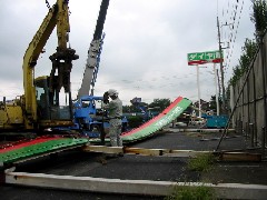 今日は看板の撤去作業の現場です。低い看板と高い看板2つを撤去しました。低い看板は20m位をユンボと協力して一気に引き倒しました。今日1日で大物は片付けることができました、解体屋さん、1日お疲れさまでした。