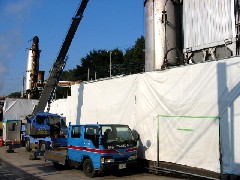 今日は焼却炉の解体作業の現場です。ダイオキシンの関係で仮囲の外側からの作業で現場を直接目に出来ませんが無線を使って無事に作業を行いました。解体屋さん、1日お疲れさまでした。